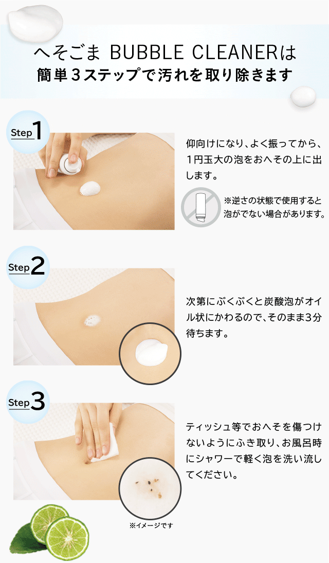 おへそへ炭酸泡を入れると、ブクブクはじけて汚れを浮かしてくれるので、あとはコットンなどでサッとふき取るだけ!指や綿棒での刺激がないので、おへそを傷つける心配がありません。